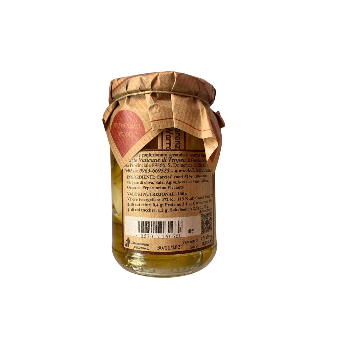 I Cuori di Carciofini Sott’Olio sono una specialità calabrese artigianale, preparata secondo le antiche tradizioni contadine del territorio di Tropea. Vengono selezionati solo i cuori più teneri dei carciofi, lavorati a mano e conservati in olio extravergine di oliva per preservarne gusto, consistenza e profumo.